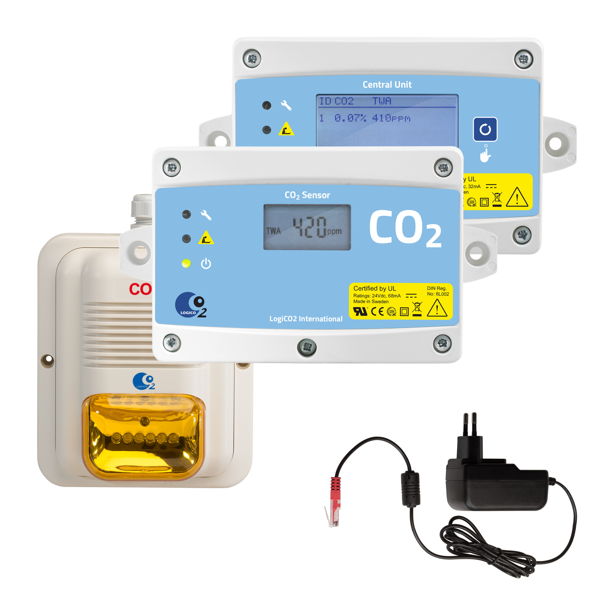 Det grundläggande koldioxidlarmet består av en centralenhet (med digital display), en (upp till åtta) sensorenheter och ett larmsystem med ljus samt ljud. Ett separat system tillför ström till systemet.